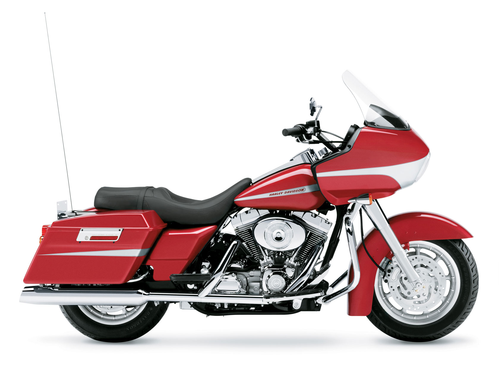 The 2004 Harley Davidson FLTRI Road Glide is a touring machine that combines trademark MoCo styling with modern features that enhance performance, offer a greater level of rider and passenger comfort, and enable it to tackle longer hauls. At its heart lies an air-cooled, 1450cc, Twin Cam 88 V-Twin powerplant mated to a five-speed manual transmission and can reach its peak torque of 117 Nm at 3500 rpm. The highlights for this model are the shark-nose fairing that houses a full instrumentation panel and an advanced audio system, a clean rear fender, a bullet rear turn signal, slash-cut mufflers, a wide rear tire, a sculpted seat, a new tank console emblem, a silver-faced gauge package and new silver brake calipers.